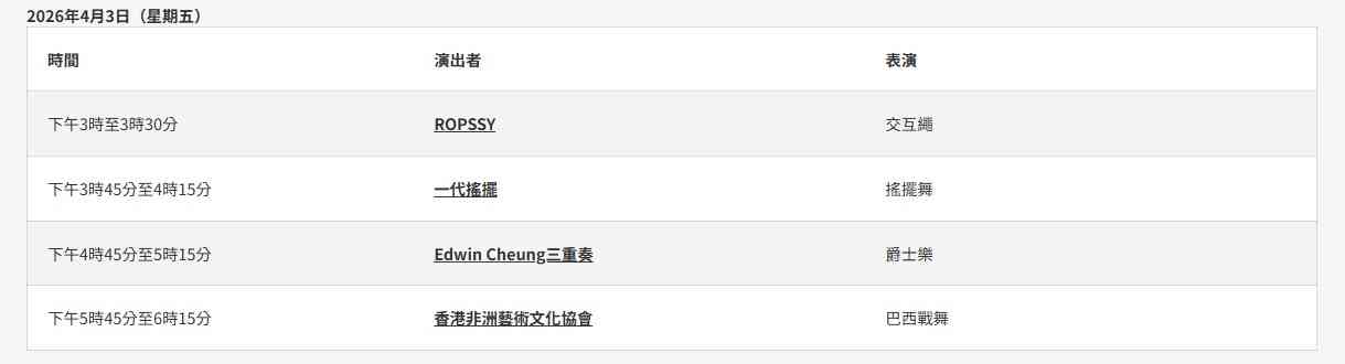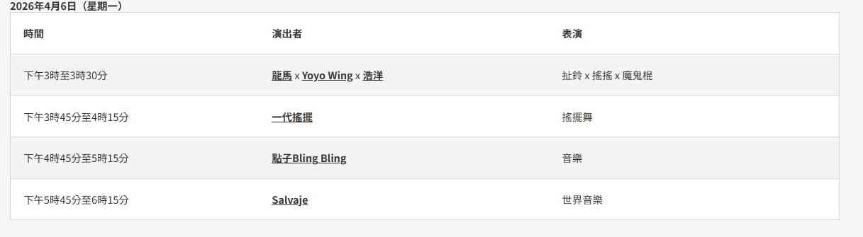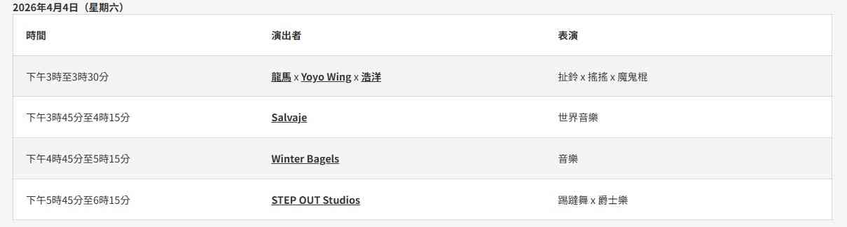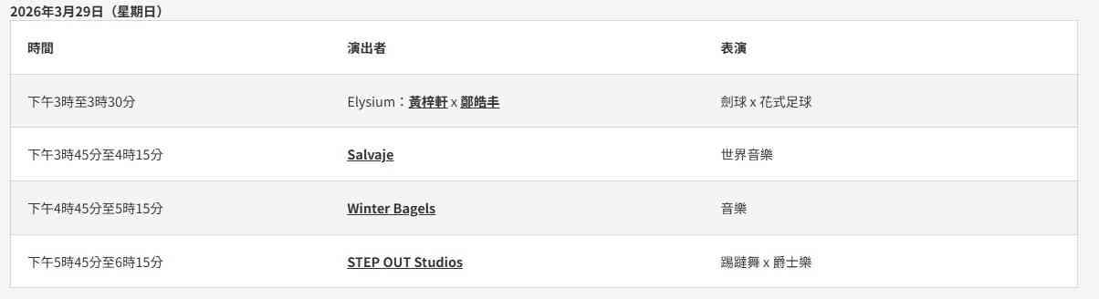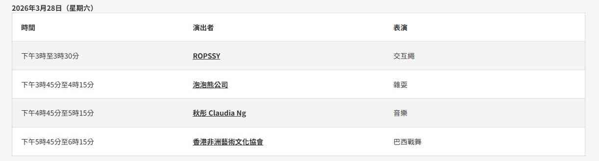 由音乐人Floro Sernande带领的巴西音乐敲击乐团Salvaje,以热力四射的森巴节奏营造嘉年华狂热气氛,邀请大家跟着节拍拍手、摆动身体。本地杂耍艺术家更会与观众近距离互动,施展各种高超技艺。曾在才艺真人秀节目《1 Take过》中登场的香港交互绳代表团体ROPSSY,将带来一边跳舞一边跳绳等高难度动作,更会在快速交替的双绳之间加入打空翻等华丽招式,技惊四座。