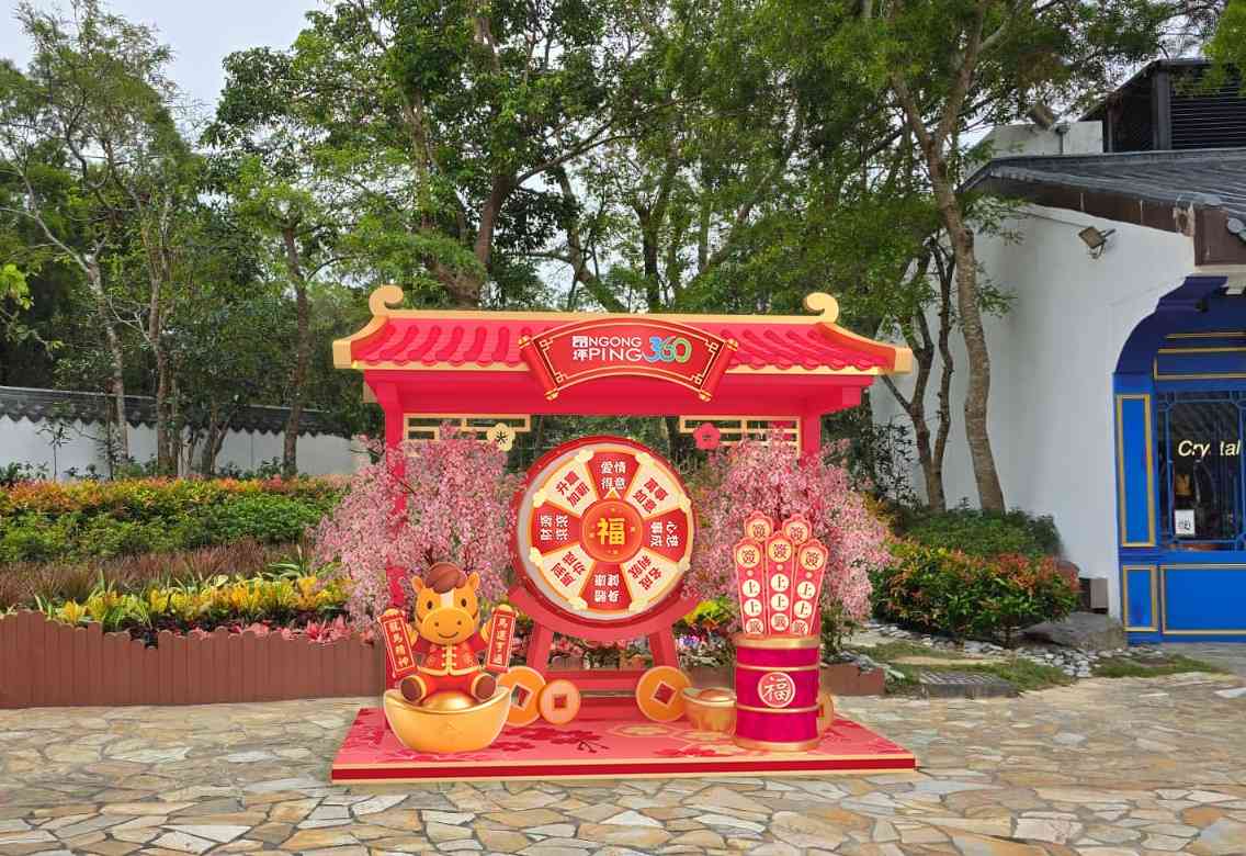 另外,昂坪市集放置了兩個新春祝福「打卡位」,位於市集牌坊旁的「馬到功成幸運輪」以桃花、籤筒及金元寶佈置,象徵幸運、健康與財富,賓客還可以轉動中間的幸運輪盤,轉出財運、事業、愛情多重好運,讓祝福疊加。