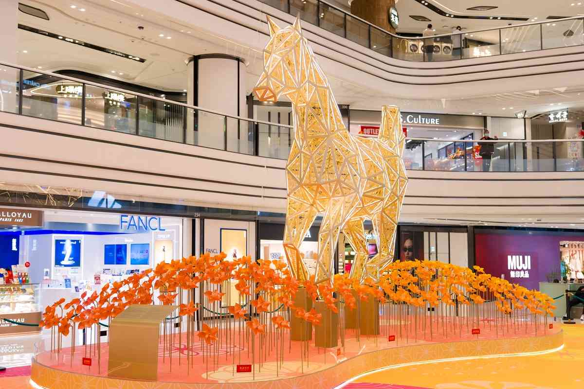 適逢馬年將至,為迎接甲午新春,在沙田區成長的本地知名建築師蕭國健特別匠心打造六米高「駿馬」藝術裝置。駿馬身型矯健,由超過500個三角幾何形狀拼合而成,每一片三角構件均鏤刻「福」字通花紋樣,整件作品共綴以超過2800個福字,寓意福澤綿延、萬福臨門。藝術裝置特意將馬首朝向流年風水旺位——東北方,取「馬首是瞻」之勢,寄寓新一年馬到功成、事事亨通。