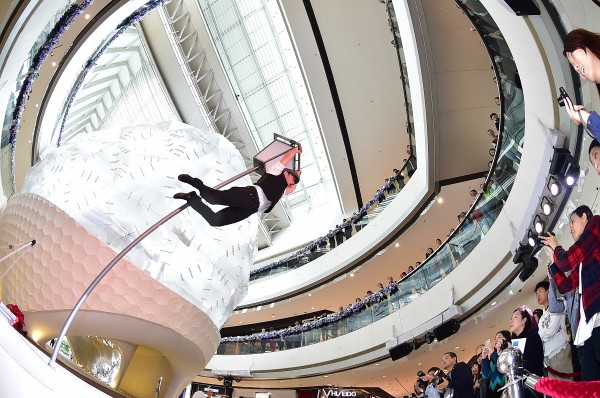 走入IFC 商場一樓中庭,聽到天籟的歌聲,但眼看四周,均找不到獻唱者的身影,抬頭看,只看見很多男人在高空中走繩索、爬電燈柱等,細問之下,原來是聖誕歌舞劇《一聽鍾情》的情節。