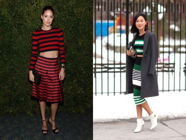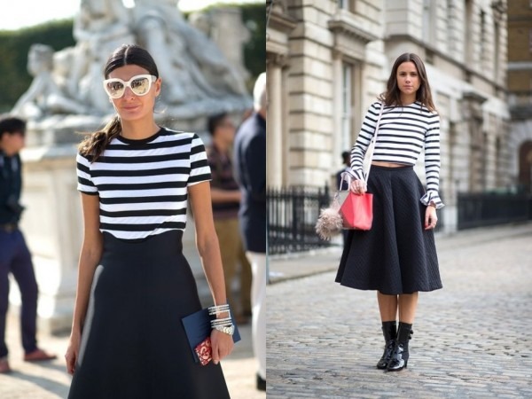 如何令你的間條Top變得優雅?穿上黑色Midi Skirt吧!蓋膝的裙子感覺優雅,帶點成熟感,為你的間條Tee造型變的更時尚。