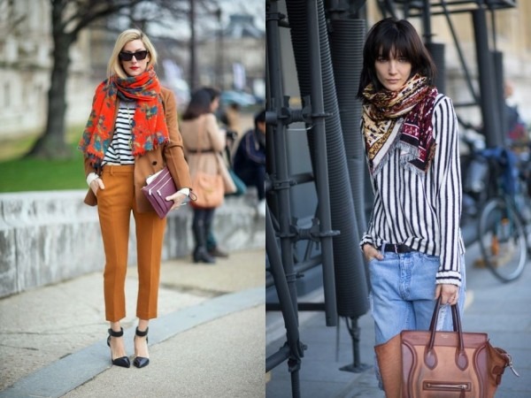 如嫌間條tee配牛仔褲太單調,就來配戴Pattern Scarf吧!間條的顏色多以藍白或黑白為主,選一條顏色比較鮮色的頸巾,加上有趣的圖案,立即可以提升時尚感,又可加入暖和的感覺。