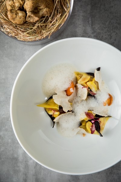 栗子意大利餛飩配瑞士甜菜、野生蘑菇、香蒜泡沫及阿爾巴白松露