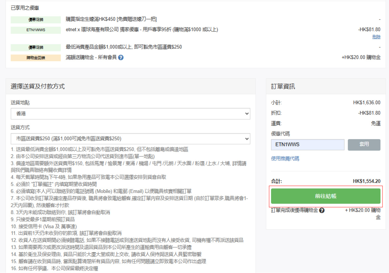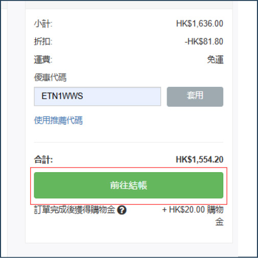 - 顧客必須於網上購物結帳時在「使用優惠代碼」一欄中輸入此優惠代碼方可兌現。