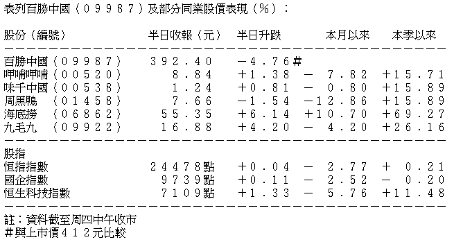 受累近期美股於高位調整,中概股百勝中國(09987)周四(10日)首掛表現失色,早段最多潛水逾6%,以半日收市價392.4元計算,未計手續費一手要蝕980元。分析師指出,百勝中國業務欠缺新意,未來增長空間有限,不約而同建議持貨者吼高離場。