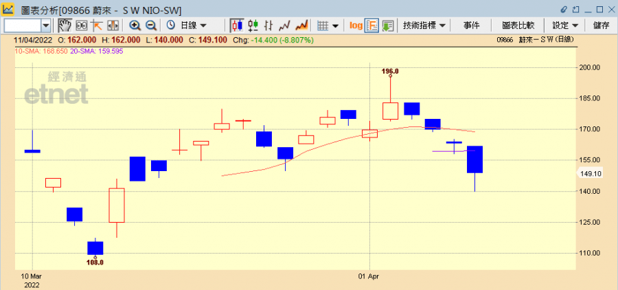 內地持續執行嚴格防疫措施,以遏制Omicron傳播,深圳、東莞、吉林省、上海、崑山等地相繼封城一周以上,其中上海與吉林是主要車廠和汽車零件供應商的生產重鎮。蔚來(09866)就宣布受疫情封鎖措施影響整車生產暫停;另受原材料價格上漲影響,部分車型要加價1萬人幣,蔚來獲大行力撐今日(11日)早市仍跌近9%。乘聯會則預料,4月內地乘用車零售將大幅低於3月,其他汽車股也齊齊急跌。