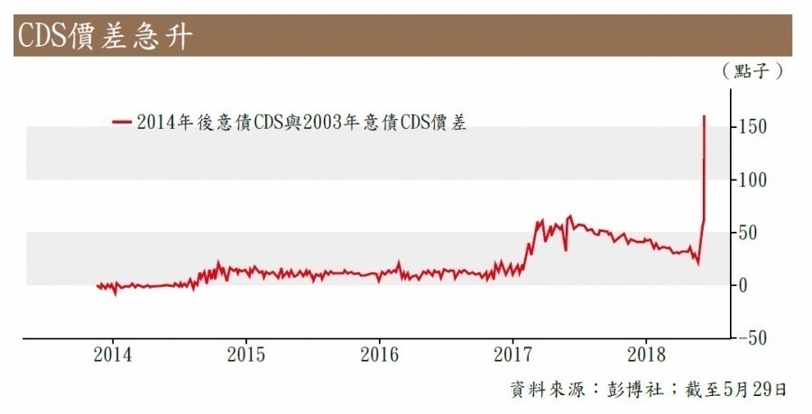 投資者目前除留意政局的發展外,亦相當關注Quitaly的機率估計。目前一個較多人採用的指標,是2014年後的意國國債信貸違約調期(Credit Default Swap, CDS)的價格,與2003年的意債CDS價格相減所得。