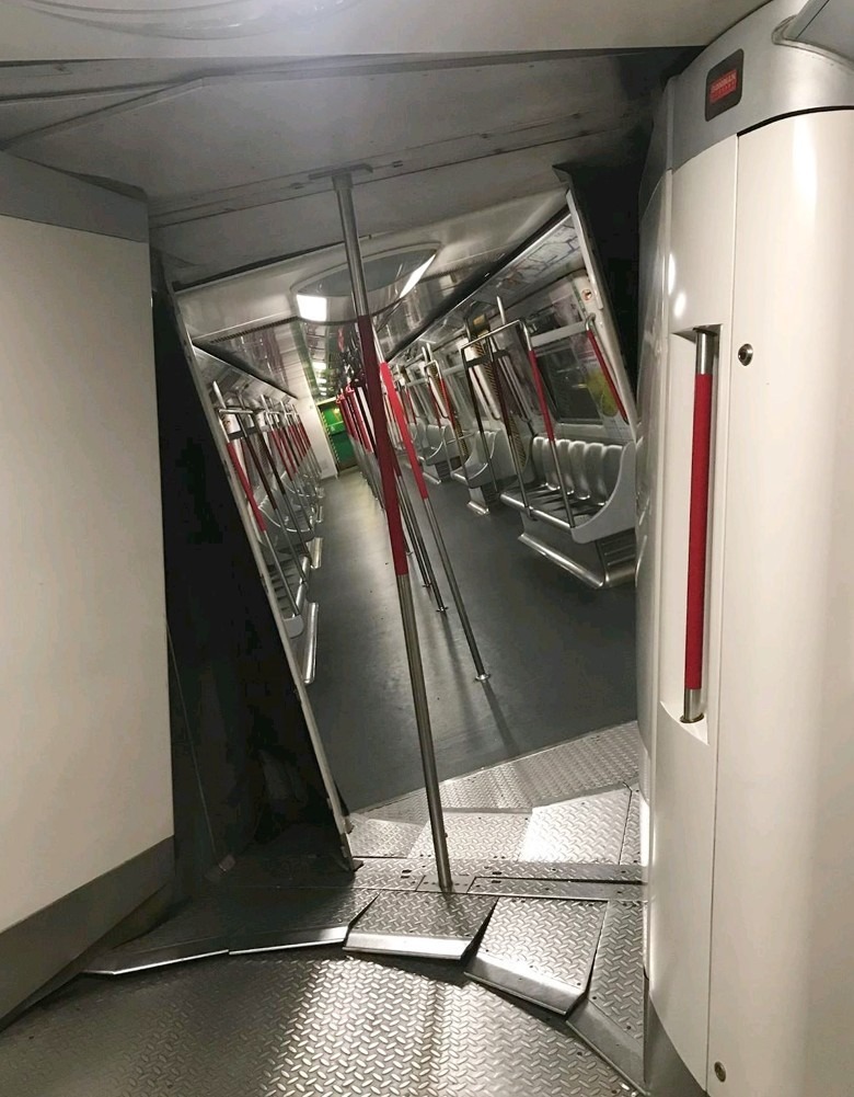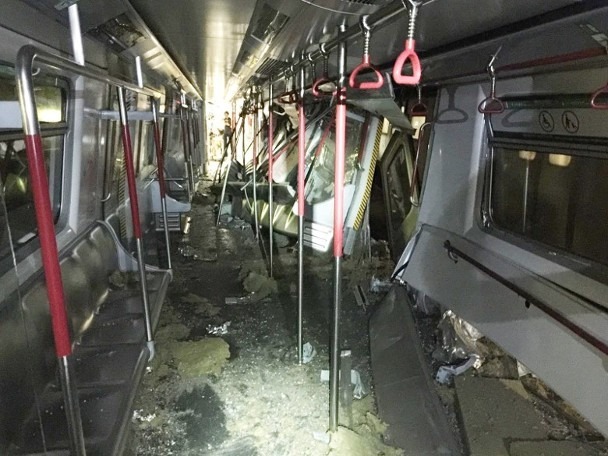 港鐵車務營運總管鄭群興指,兩架列車不是迎頭相撞而是車身擦過,但網上圖片顯示其中一列車頭已脫離路軌,另一列車箱亦嚴重損毀。(網上圖片)
